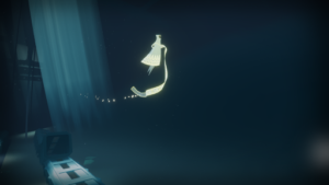 The gameplay is simple, but well executed. The player can walk, jump and even glide, so long as their scarf is glowing. The light of the scarf replenishes when the character is in contact with the earth and the scarf expands by collecting white symbols which are scattered throughout the world. The length of the scarf determines how long the player can glide, while also acting as the character’s health bar. By the end of the game the fabric flows absurdly behind you, allowing for near infinite flight.